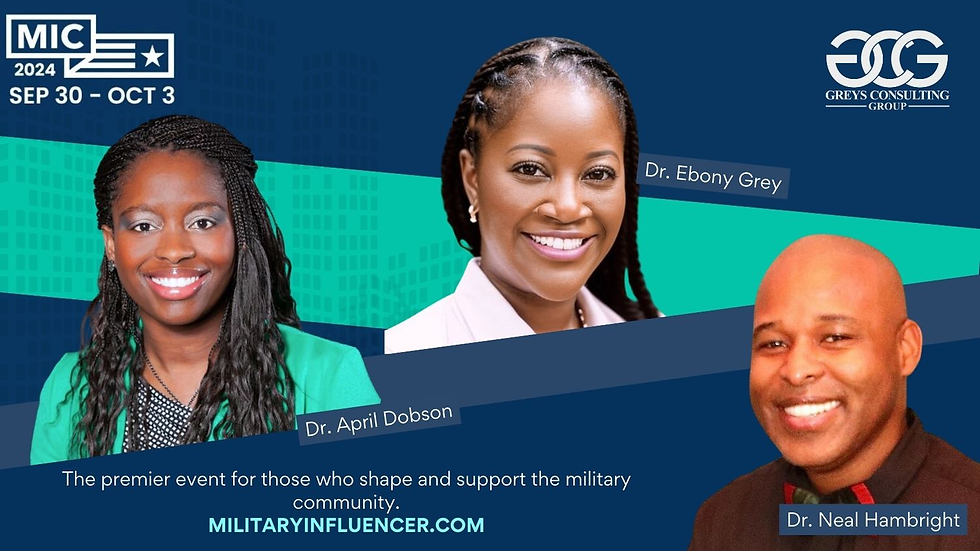 We are excited to remind you that Dr. Ebony Grey, Dr. April Dobson, and Dr. Neal Hambright will speak at the Military Influencer Conference (MIC) from September 30th to October 3rd, 2024 in Atlanta!